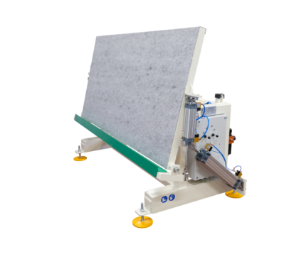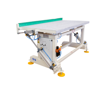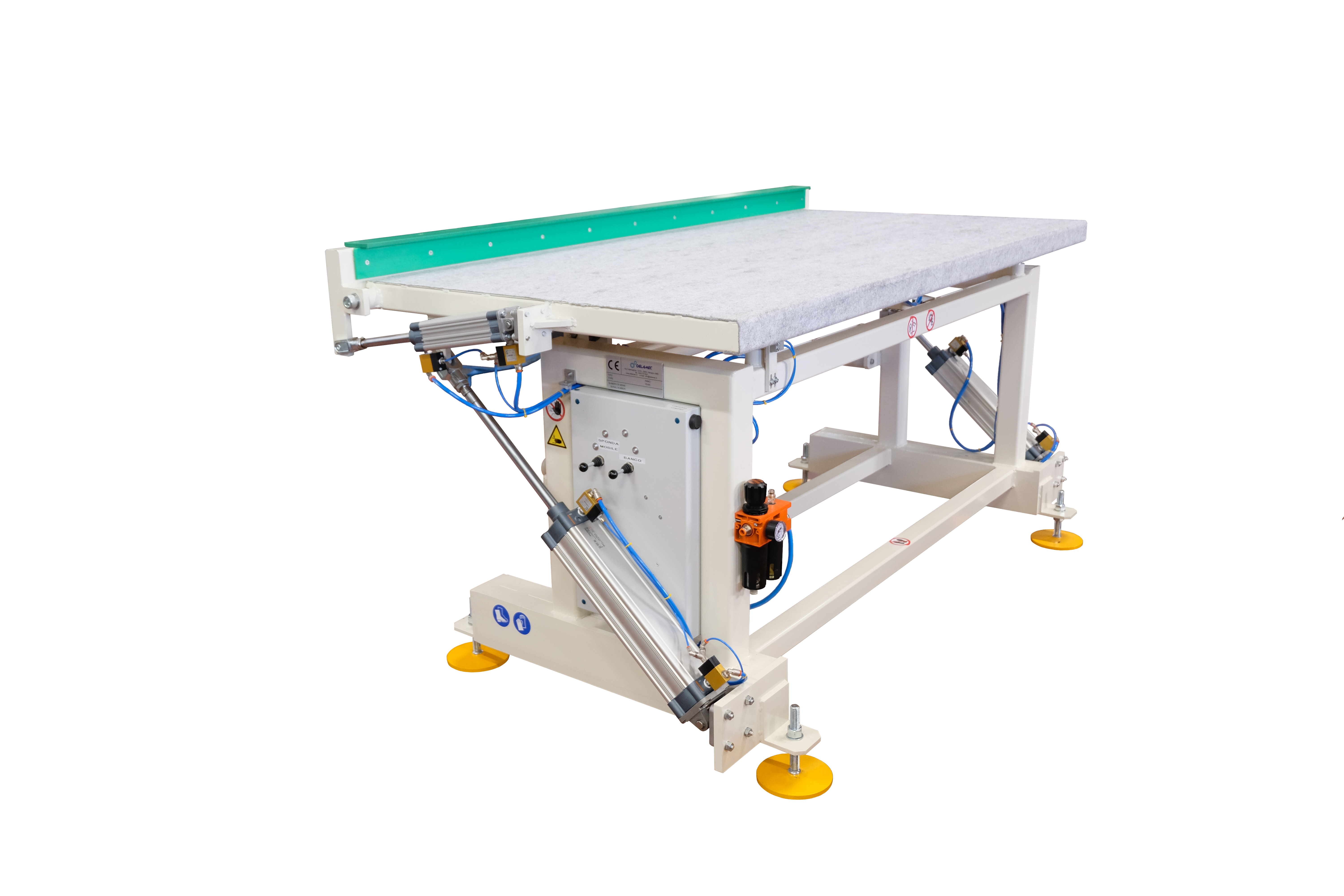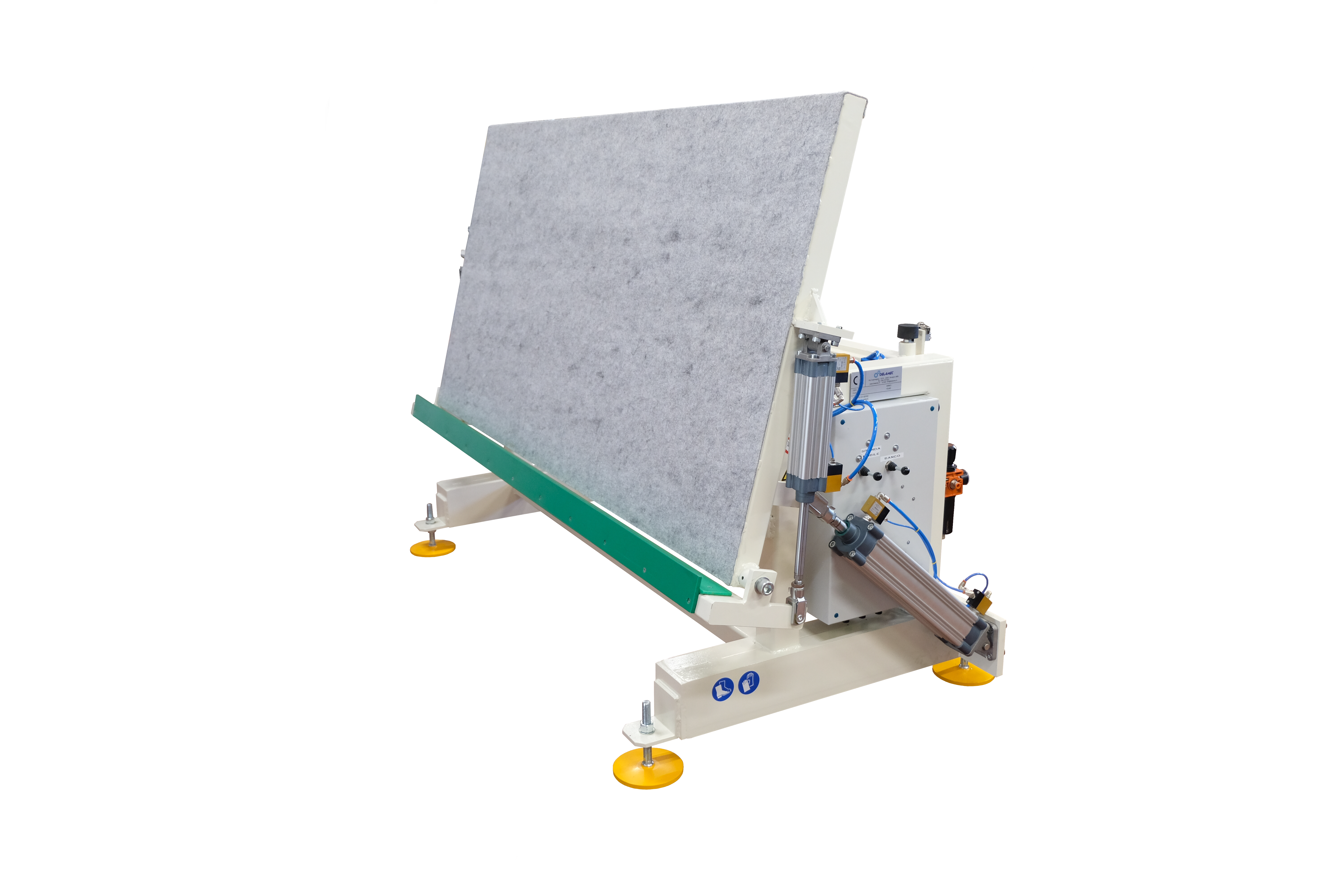 Sul piano del banco è applicata una speciale moquette antigraffio che ha la funzione di  preservare la superficie delle lastre, è disponibile anche l’opzione con velo d’aria per facilitarne la movimentazione sul piano e proteggere ulteriormente le superfici più delicate (vetro).