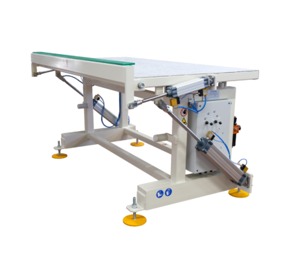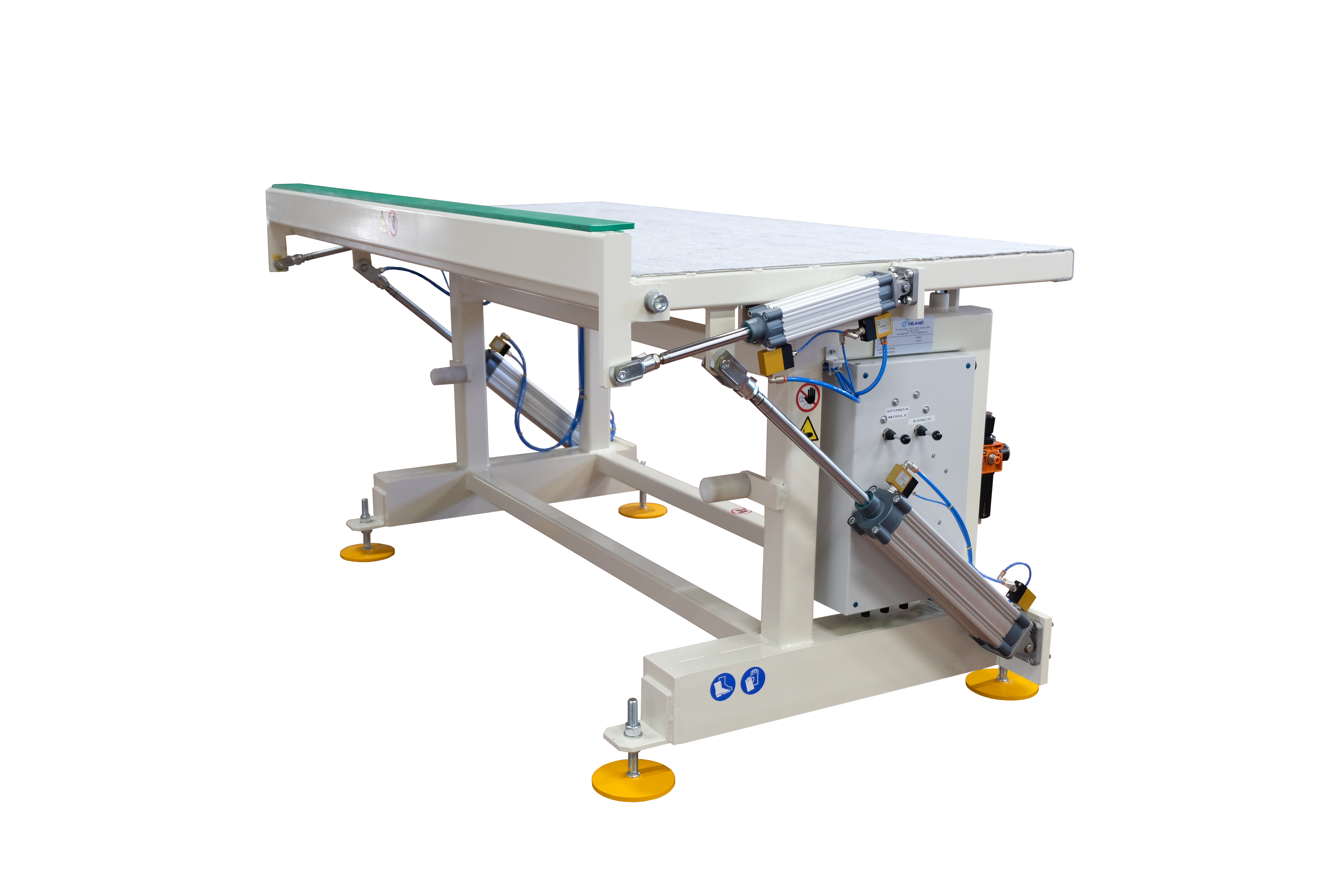 La caratteristica principale del banco è il piano inclinabile che permette al singolo operatore di caricare la lastra mediante carroponte e di poterla ruotare in posizione orizzontale in completa autonomia e sicurezza pronta per eseguire le operazioni di finitura e controllo.